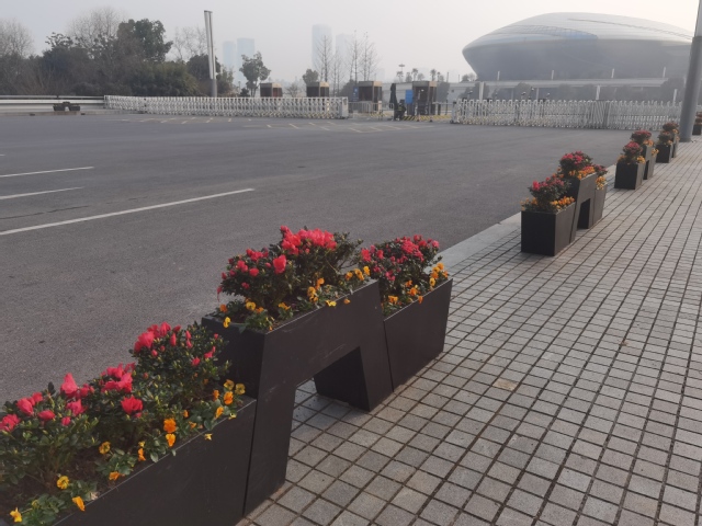 江蘇大劇院水韻路中分帶的花球也換上了“新裝”。10個巨大的羽衣甘藍(lán)花球被粉色的報春花和紅黃顏色角堇組成的花帶簇?fù)碇?/span>與兩邊的直線橙色花邊、方形花卉矩陣、流線型花帶一起構(gòu)成了一幅色彩斑斕、氣勢恢宏的絢麗畫卷,不但為兩會烘托出莊嚴(yán)隆重的氛圍,也洋溢著春節(jié)喜慶的氣氛。