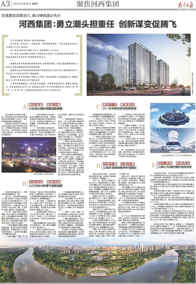 在南京城市建設(shè)史上,河西注定是濃墨重彩的一筆。2002年,河西新城區(qū)建設(shè)拉開大幕,南京首個以新區(qū)開發(fā)建設(shè)為主責(zé)主業(yè)的投融資平臺——河西集團應(yīng)運而生,陸續(xù)建成了南京國際博覽中心、青奧雙塔、濱江風(fēng)光帶等一批標(biāo)志性工程,以及學(xué)校、醫(yī)院、道路等一批基礎(chǔ)設(shè)施。2019年,按照市委市政府的部署,“事企分離”后,河西集團獨立運作。為適應(yīng)激烈的市場競爭,河西集團以解放思想為先導(dǎo),以體制轉(zhuǎn)換為動力,以機制創(chuàng)新為突破,通過思想“破冰”引領(lǐng)行動“破題”?!e極穩(wěn)健規(guī)范解決混編混崗問題,形成內(nèi)設(shè)機構(gòu)及職能調(diào)整方案,在確保各項工作有序銜接的前提下,實現(xiàn)機構(gòu)設(shè)置及人員調(diào)整平穩(wěn)過渡。 ——建立健全“三重一大”決策制度、黨委會議事規(guī)則等管理制度;以戰(zhàn)略管控、組織架構(gòu)、人力資源等管理流程塑造為重點抓好頂層設(shè)計,倒逼管理提升。 ——深入推進“三項制度”改革,開展員工崗位“雙向選擇”,實行全員績效考核。推進任期制和契約化管理,經(jīng)理層成員任期制和契約化管理占比100%?!e極推進數(shù)字化轉(zhuǎn)型,全力打造“數(shù)字河西”,建立起1個專網(wǎng)、2個體系、3個平臺的信息化體系架構(gòu),促進各業(yè)務(wù)板塊協(xié)同融合。聚焦高質(zhì)量發(fā)展,對業(yè)務(wù)板塊進行深度優(yōu)化,深入推進力量整合,提升市場競爭力?!獖W體公司堅持走專業(yè)化、特色化、精品化道路,以精品工程鑄就品質(zhì)住宅新標(biāo)桿,攜11個項目重回南京樓市中心舞臺?!M建集中建設(shè)管理中心,全力拓展集中建設(shè)市場業(yè)務(wù),集中實施建設(shè)項目有序推進?!七M新城公司、項目公司整合重組,加快市場化轉(zhuǎn)型;組建紫金商業(yè)管理公司,統(tǒng)一運營集團商業(yè)資產(chǎn);推進物業(yè)板塊戰(zhàn)略改革,成立江山智聯(lián)(江蘇)物業(yè)服務(wù)公司?!七M“公園—園林—市政”板塊融合,板塊內(nèi)各公司發(fā)揮各自優(yōu)勢,合力拓展外部市場?!霞瘓F金融資產(chǎn),成立基金公司,全面聚焦數(shù)字經(jīng)濟、電子信息、雙碳科技等方向,積極布局工業(yè)互聯(lián)網(wǎng)、智慧城市、清潔能源技術(shù)、綠色建筑技術(shù)等細分賽道。與此同時,啟動園林公司混合所有制改革;理順集團旗下6家酒店管理體制;商業(yè)板塊首個混合所有制項目招商有序展開。