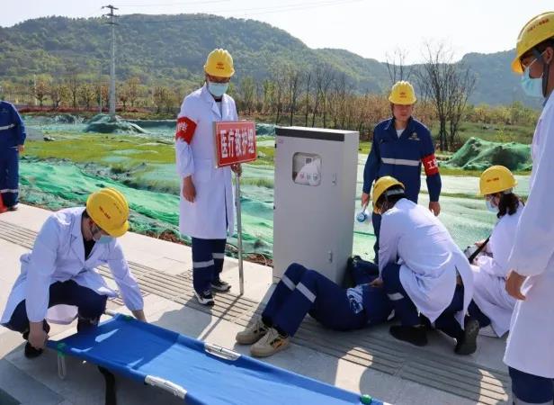 本次演練主要分為事故演練和應(yīng)急處置措施培訓(xùn)兩部分。首先開始的事故演練以一名電工檢修配電箱時突發(fā)觸電事故為背景。項目部接到事故匯報后,立即按既定預(yù)案啟動事故應(yīng)急處置程序,各應(yīng)急小組迅速到位、協(xié)調(diào)配合,分別承擔(dān)現(xiàn)場警戒、人員應(yīng)急醫(yī)護救援、后勤物資保障等任務(wù),順利完成了本次演練。在應(yīng)急處置措施培訓(xùn)環(huán)節(jié),項目部邀請了溧水區(qū)永陽鎮(zhèn)社區(qū)醫(yī)院醫(yī)生現(xiàn)場講解、培訓(xùn)了心肺復(fù)蘇、人工呼吸等施工常見事故的緊急處理措施。全部演練結(jié)束后,南京市溧水區(qū)城鄉(xiāng)建設(shè)局質(zhì)量安全監(jiān)督站負責(zé)人對演練成果及項目部有序有效的組織能力表示了肯定。
