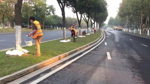 公司嚴格要求刷白“精細化”養(yǎng)護標準,首先根據(jù)喬木、花卉類樹木的特性,區(qū)別了刷白高度;其次,在刷白時采取了墊襯措施,確保地面和地被植物干凈美觀;最后,按照止口平整,高度一致,刷白均勻,不留死角的要求,在城區(qū)多主干道和公園同時開展刷白工作。