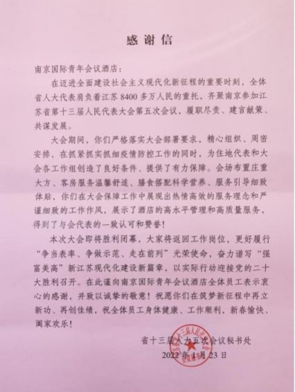 江蘇省第十三屆人民代表大會第五次會議于2022年1月20日至1月23日在南京召開。河西集團青奧城公司國際青年會議酒店和金陵江濱酒店作為本次大會的重點接待單位,圓滿完成了此次接待任務,獲得與會代表的一致好評。
