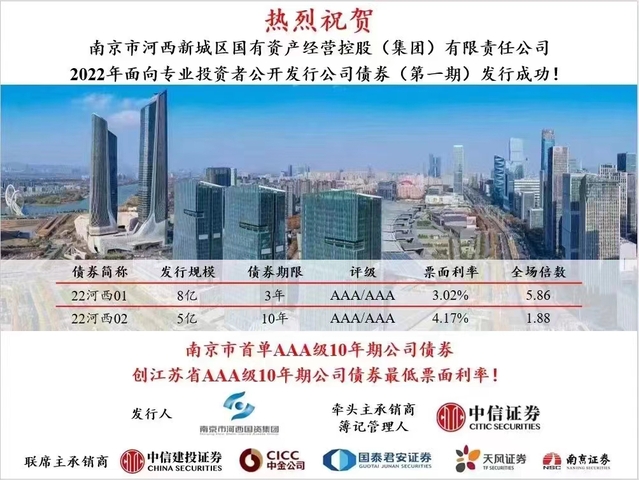 本次發(fā)行為批文下首期發(fā)行,由中信證券擔(dān)任牽頭主承銷商及簿記管理人,在主承銷商的共同努力下獲得了圓滿成功。本次發(fā)行獲得了市場投資者的高度認(rèn)可,體現(xiàn)了投資人對河西集團未來業(yè)務(wù)發(fā)展的強烈信心!本次發(fā)行的10年期品種,亦為南京市首單10年期公司債券。河西集團本次發(fā)行10年期公司債券,以較低的融資成本鎖定了長期的資金需求,充分體現(xiàn)河西集團對市場時機的準(zhǔn)確把握以及對直融市場融資工具成熟的使用能力,為債券市場作出了積極的示范效應(yīng)。